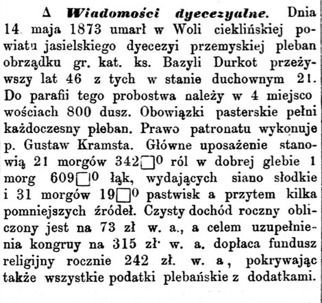 Dnia 14 maja 1873 umarł w Woli cieklińskiej powiatu jasielskiego dyecezyi przemyskiej pleban obrządku gr. kat. ks. Bazyli Durkot przeżywszy lat 46 z tych w stanie duchownym 21.