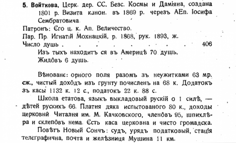 Войкова. Церк. дер. СС. Безс. Космы и Даміяна, создана 1801 р. Визита канон. въ 1869 р. черезъ АЕп. Іосифа Сембратовича. Патронъ: Єго ц. к. Ап. Величество. Пар. Пр. Игнатій Мохнацкій р. 1868. рук. 1893, ж. Число чушь 406. Изъ тыхъ находить ся въ Америцѣ 70 дущь. Жидôвъ 6 душь. ВѢнованє: орного поля разомъ зъ неужитками 63 мр. сж., чисуый дохбдъ изъ грунту почисленъ на 68 к. Додатокъ зъ касы 1132 к. 12 с., податокъ 22 к. 88 с. Школа етатова, языкъ выкладовьый рускій о 1 силѢ, — дѢтей рускихъ 66. Платня дяка испытованого 80 к., доходы Церковнй. Читалня им. М. Качковского, членôвъ 95, шпихлѢра и склепôвъ нема. Єсть каса церковна и чисто громадска. Повѣтъ Новый Сончъ: судъ, урядъ податковый, стація телеграфична, почта и желъзниця Мушина 11 км.